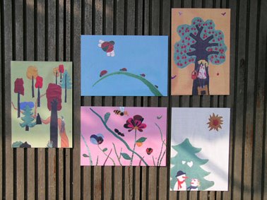Côté illustration, les premiers dessins sont en tissus, mélangeant le système du patchwork et de la broderie. L'encre de Chine et la simplicité de la plume viendra après.